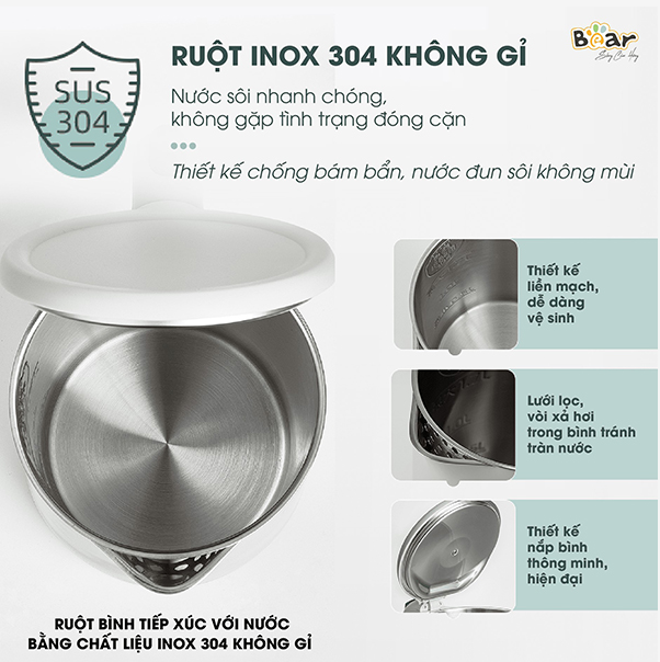 - Ruột bình inox 304 an toàn và kháng khuẩn