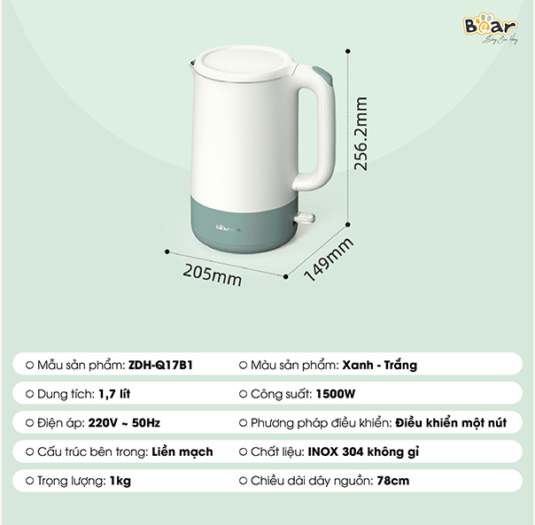 Ấm đun nước Bear ZDH-Q17B1 không chỉ là sự lựa chọn hoàn hảo cho gia đình mà còn là người bạn đồng hành tin cậy trong việc cung cấp nước nóng sạch và an toàn.