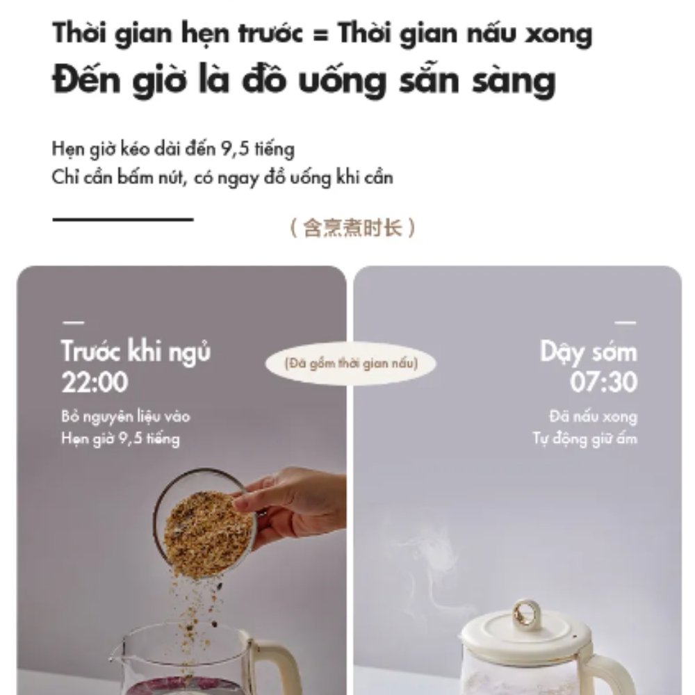 Một tính năng đáng kể của Ấm Pha Trà Siêu Tốc Bear YSH-E15M1 là khả năng hẹn giờ. Bạn có thể đặt thời gian từ 1 đến 9,5 tiếng, và đồ uống ngon lành sẽ sẵn sàng cho bạn vào thời điểm bạn mong muốn. Không còn cần đợi đến khi nước sôi hoặc trà pha đúng hương vị.