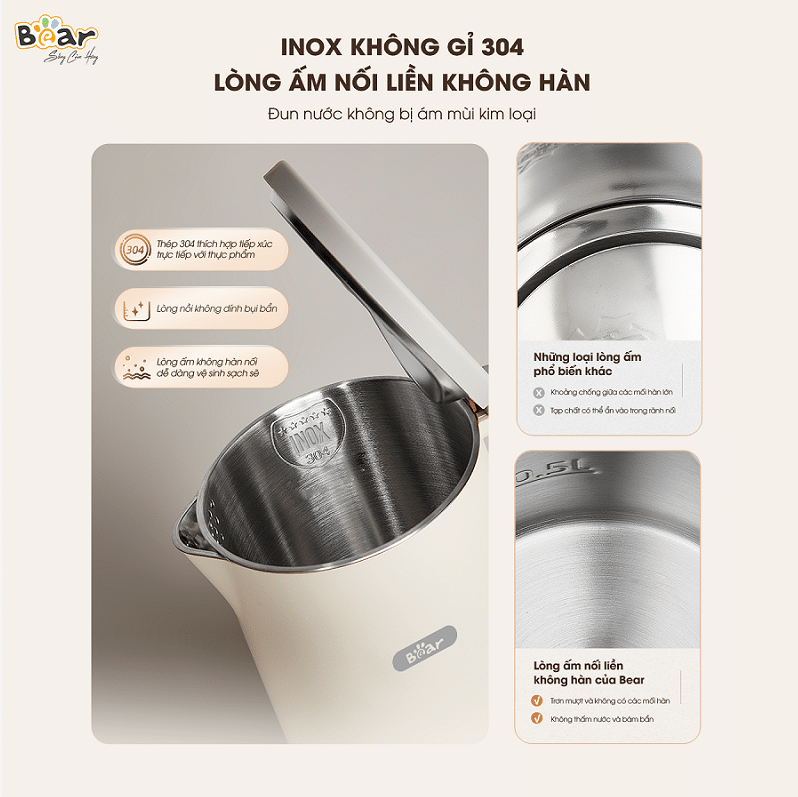 - Inox 304 không gỉ, lòng ấm nối liền không hàn