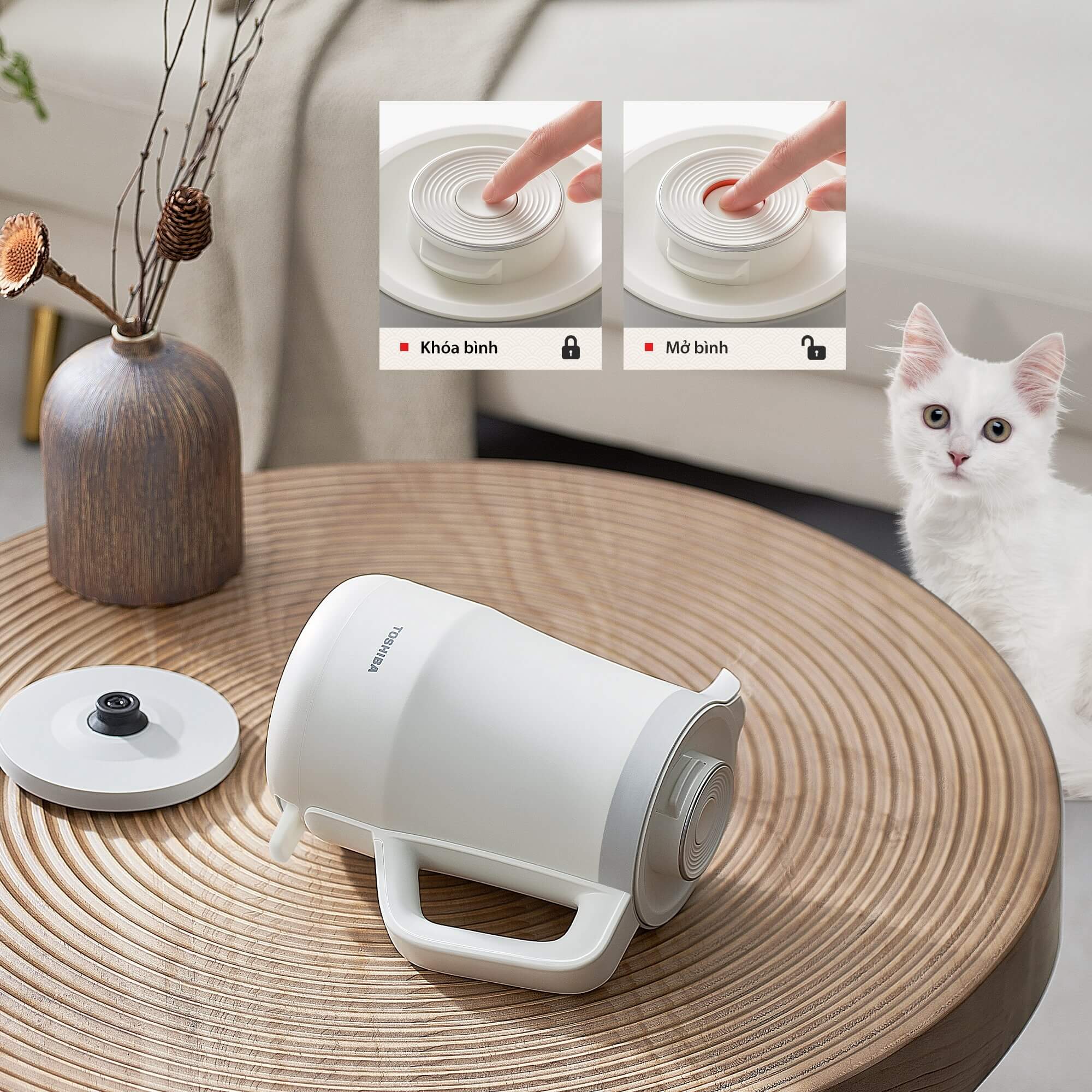 Ấm Siêu Tốc Chống Tràn Toshiba KT-15DRTVN trang bị đệm khử mùi bằng chất liệu Silica đạt chuẩn ROHS Châu Âu – loại bỏ mùi hôi hiệu quả, bảo đảm nước luôn sạch và an toàn. Hơn nữa, khóa nước nóng tích hợp ngay trên nắp bình giúp chống tràn ngay cả khi bình bị nghiêng, phù hợp cho gia đình có trẻ nhỏ hoặc thú cưng.