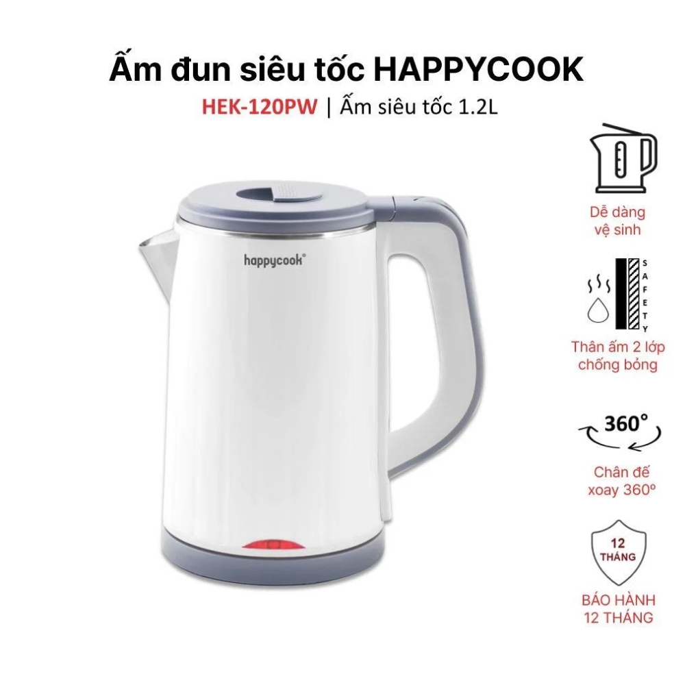 Ấm Siêu Tốc Inox 2 Lớp 1.2 Lít Happy Cook HEK-120PW là sản phẩm gia dụng nhà bếp lý tưởng cho những gia đình nhỏ, đáp ứng mọi nhu cầu đun nước một cách hiệu quả và an toàn.