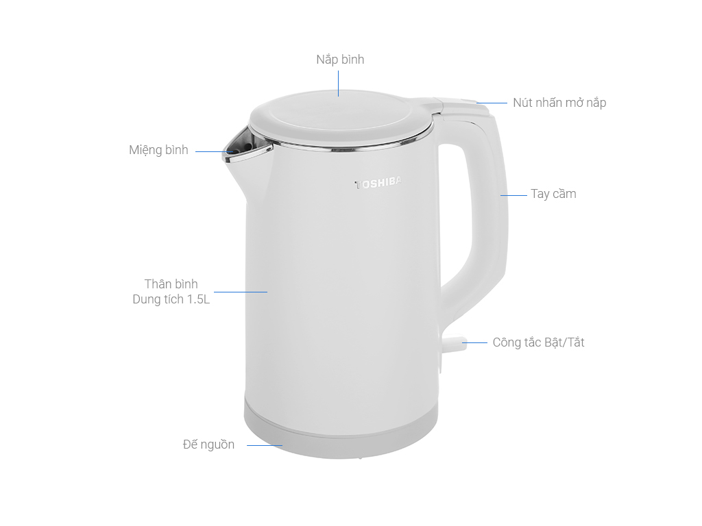 Ấm đun siêu tốc Toshiba KT-15DS1PV không chỉ sở hữu thiết kế hiện đại với tông màu trắng xám trang nhã mà còn được chế tạo từ những vật liệu cao cấp, đảm bảo an toàn và độ bền trong suốt quá trình sử dụng.
