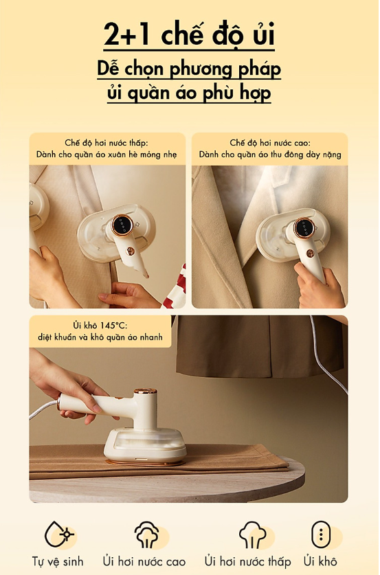 - Bàn ủi cầm tay với 3 chế độ ủi: ủi khô, ủi hơi nước cao và ủi hơi nước thấp