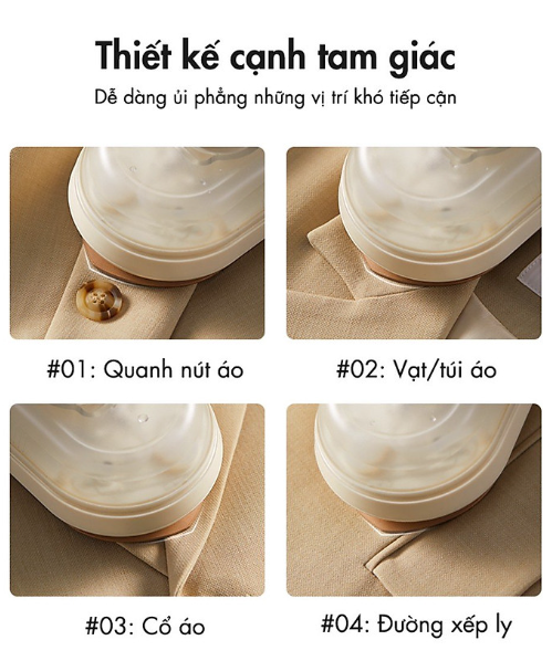 Bàn ủi được thiết kế với cạnh tam giác giúp dễ dàng ủi phẳng các vị trí khó tiếp cận. Tay cầm có thể xoay linh hoạt 90 độ, giúp điều chỉnh ngang dọc một cách thuận tiện.