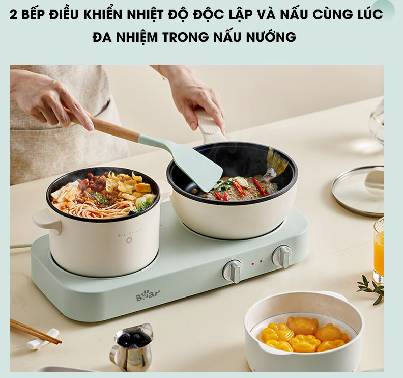 Bếp điện đôi đa năng kèm nồi chảo Bear SB-BD02N được thiết kế với hai nồi và hai bếp nấu riêng biệt, cho phép bạn nấu nhiều món ăn cùng lúc mà không cần lo lắng về mùi vị giao nhau. Điều này đặc biệt hữu ích trong việc chuẩn bị bữa ăn đa dạng và phong phú.