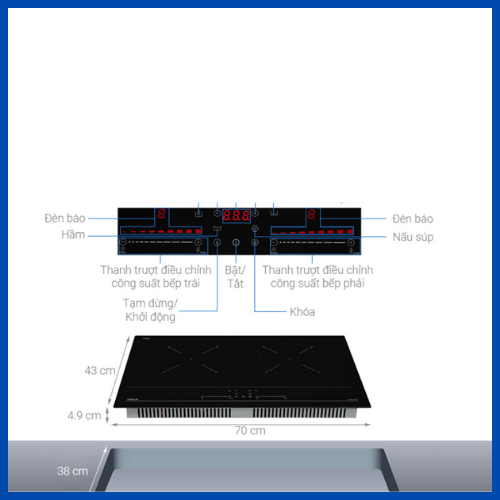 Viền bếp được bo cạnh an toàn, tạo cảm giác liền mạch với mặt bàn đá. Bảng điều khiển cảm ứng được thiết kế tối giản nhưng hiện đại, hiển thị rõ ràng thông số công suất, nhiệt độ, hẹn giờ và cảnh báo nhiệt dư, mang lại trải nghiệm sử dụng thân thiện và tiện lợi.