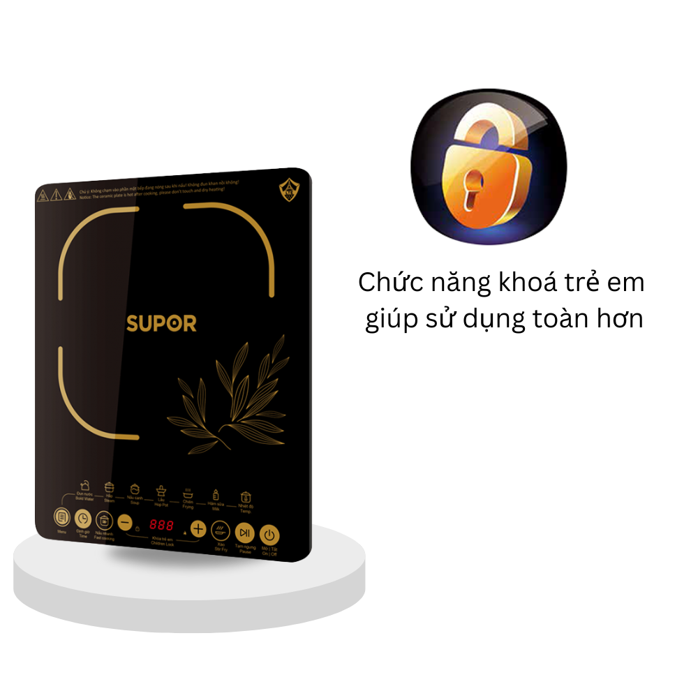 Bếp Supor SDHCB11TVN-YL-210 được trang bị tính năng: khoá trẻ em đặc biệt giúp an toàn trong quá trình sử dụng, tính năng nấu tạm ngưng ghi nhớ thông minh, khởi động lại dễ dàng, chế độ chờ tiết kiệm năng lượng