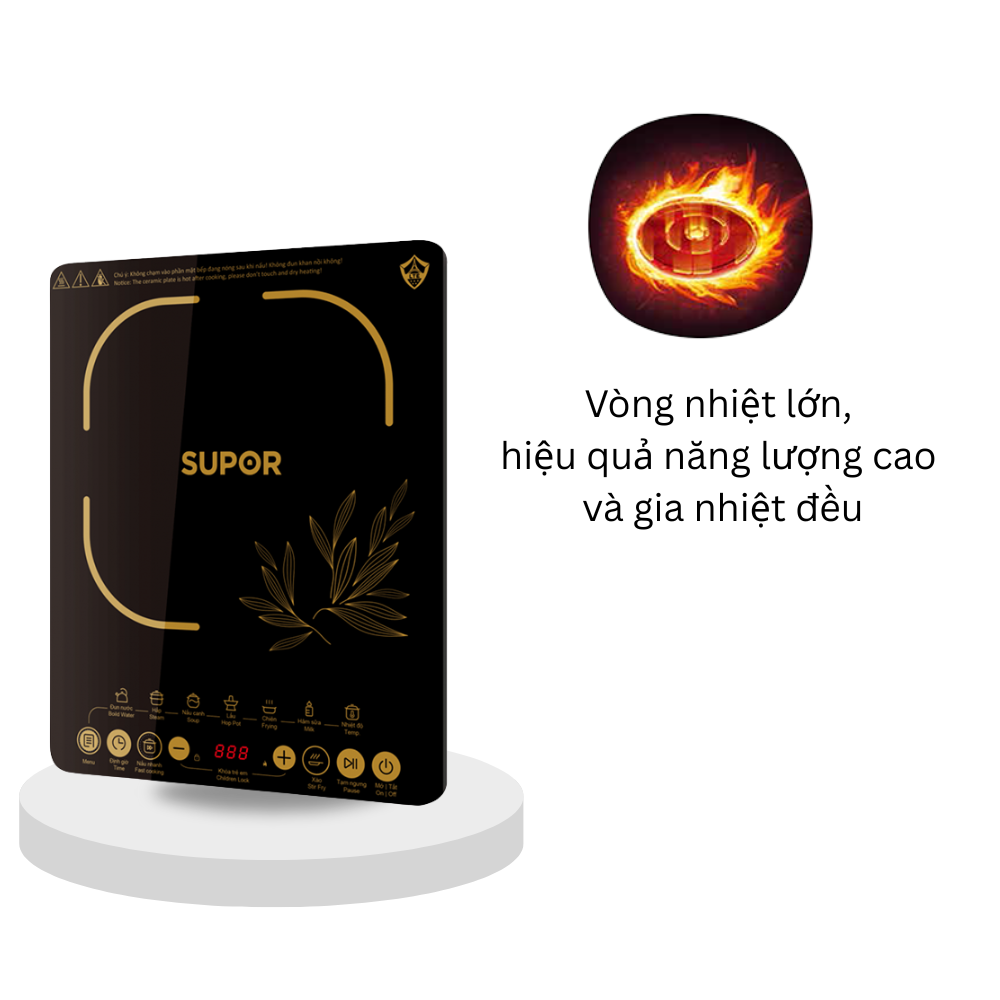 Bếp Supor SDHCB11TVN-YL-210 với thiết kế vòng nhiệt lớn giúp hiệu quả năng lượng cao và gia nhiệt đều
