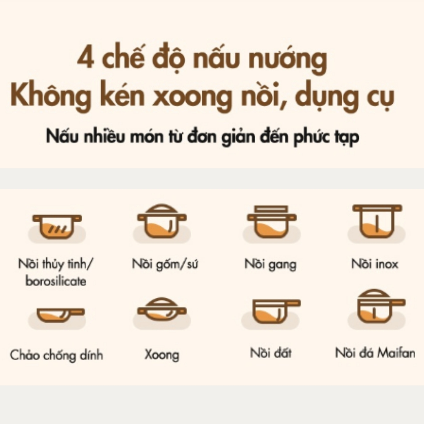 Sản phẩm được tích hợp với 4 chế độ nấu được cài đặt sẵn: chiên, xào, hầm, nấu lẩu, giúp bạn thực hiện nhiều loại món ăn khác nhau một cách tiện lợi.