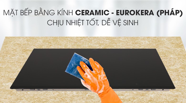 Mặt kính Ceramic - Eurokera (Pháp) với độ dày 0.5 cm không chỉ mang lại vẻ đẹp sang trọng mà còn đảm bảo độ bền và khả năng chịu lực, chịu nhiệt tốt. Đồng thời, việc lau chùi cũng trở nên dễ dàng hơn bao giờ hết.