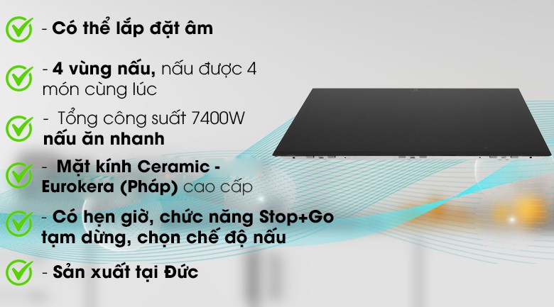 - Bảng điều khiển: Cảm ứng, mặt bếp: Kính Ceramic - Eurokera (Pháp)
