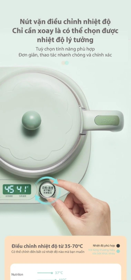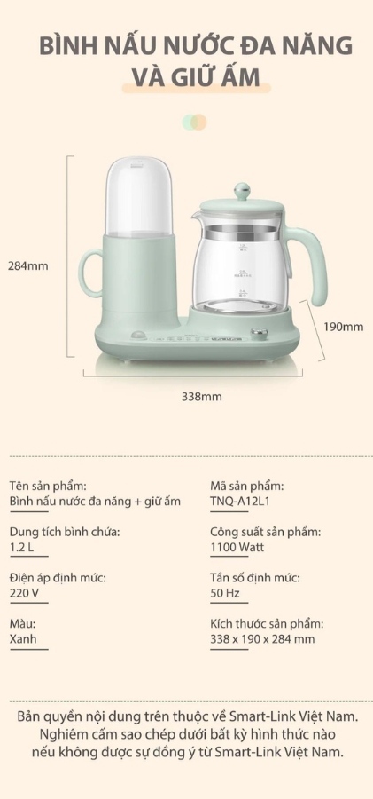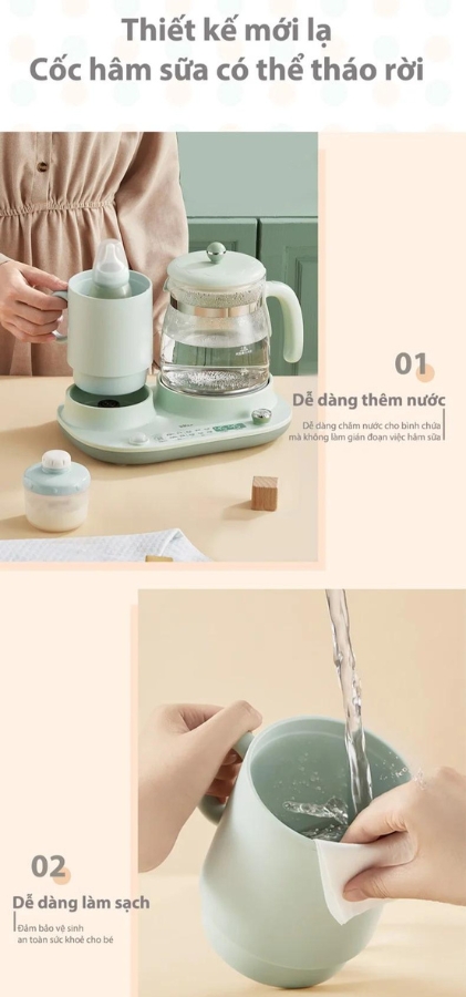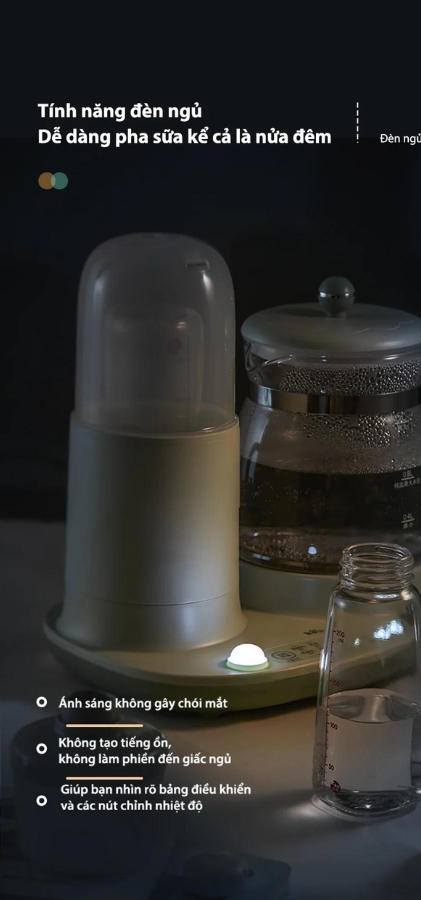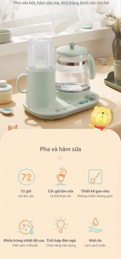 - Tiện ích: Pha trà, pha sữa, giữ ấm, đun nước, tiệt trùng hơi nước, rã đông sữa và làm ấm, hâm nước thức ăn dặm
