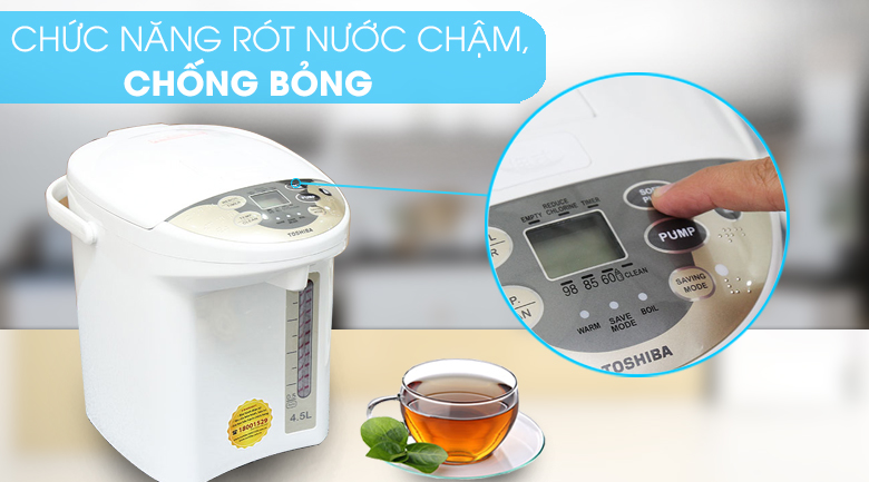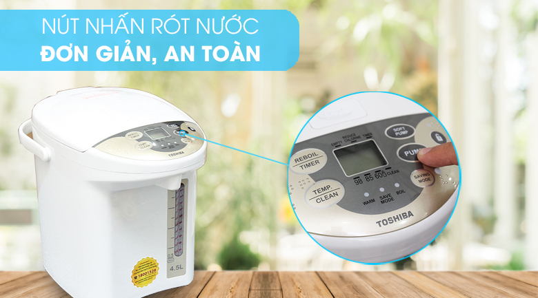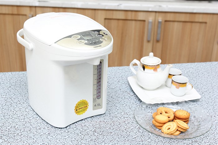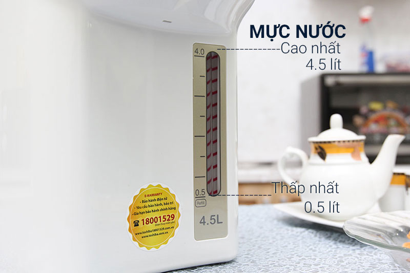 Với dung tích 4.5 lít, bình thủy điện Toshiba đáp ứng tốt nhu cầu sử dụng nước nóng liên tục trong ngày cho cả gia đình. Từ việc pha trà, cà phê, nấu mì đến trụng rau, sản phẩm luôn đảm bảo nguồn nước nóng sẵn sàng chỉ với thao tác đơn giản. Bên cạnh đó, thang hiển thị mực nước giúp bạn dễ dàng theo dõi lượng nước bên trong.