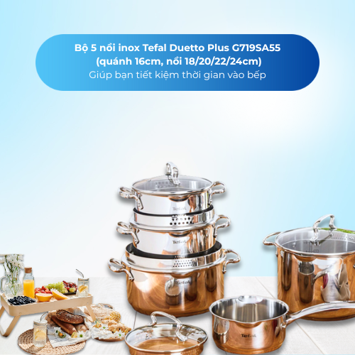 Bộ 5 nồi inox Tefal Duetto Plus G719SA55 là một trong những dòng sản phẩm gia dụng nhà bếp bán chạy nhất, được đánh giá cao bởi độ bền, an toàn và hiệu suất nấu vượt trội.