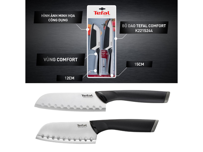 Bộ dao Tefal Comfort K221S244 15cm và 12cm là gia dụng nhà bếp hiện đại, tiện lợi, tôn lên vẻ sang trọng cho căn bếp của gia đình bạn.