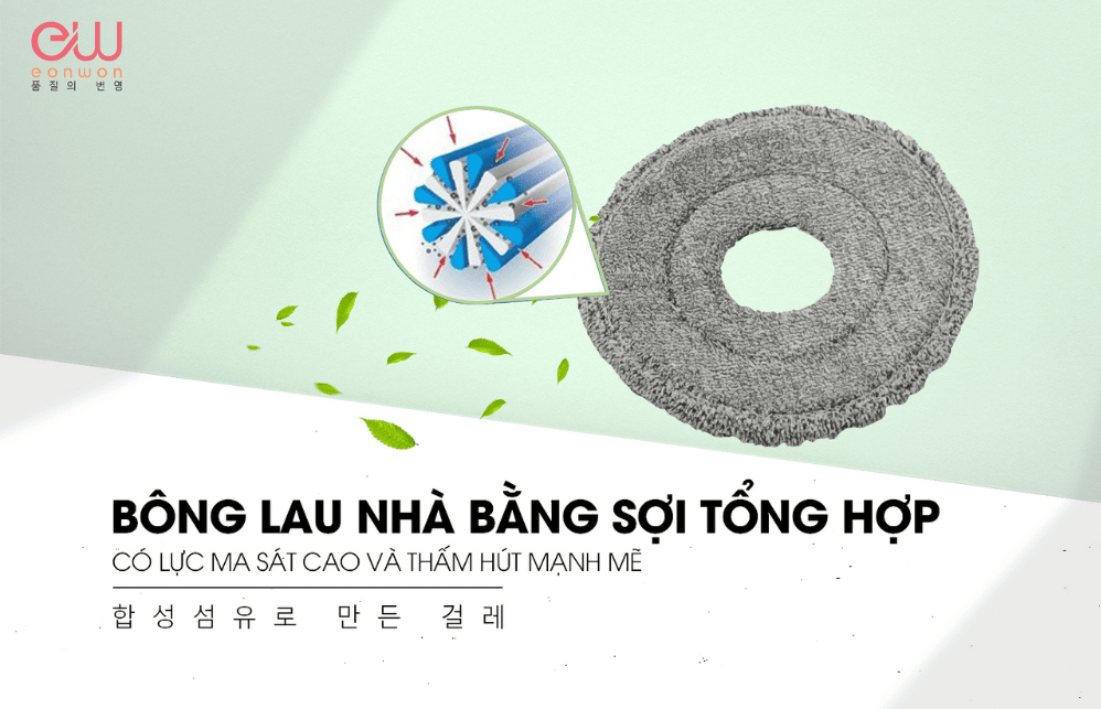 Sản phẩm sử dụng bông lau bằng sợi tổng hợp có lực ma sát cao, giúp đánh bay bụi bẩn và vết bẩn cứng đầu một cách dễ dàng. Đặc biệt, bông lau có khả năng thấm hút mạnh, giúp sàn nhà khô nhanh hơn, tránh tình trạng ẩm ướt khó chịu.