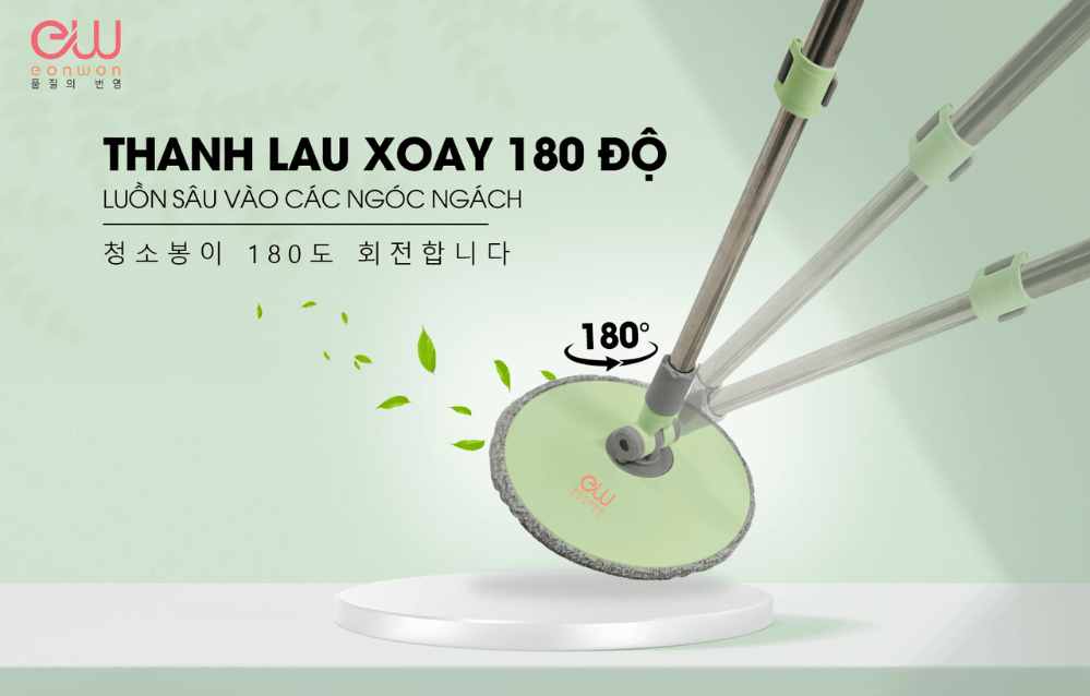 Thiết kế thanh lau linh hoạt với khả năng xoay lên xuống 180 độ, giúp bạn dễ dàng làm sạch dưới gầm giường, góc tủ hay những vị trí khó tiếp cận khác mà không tốn nhiều công sức.