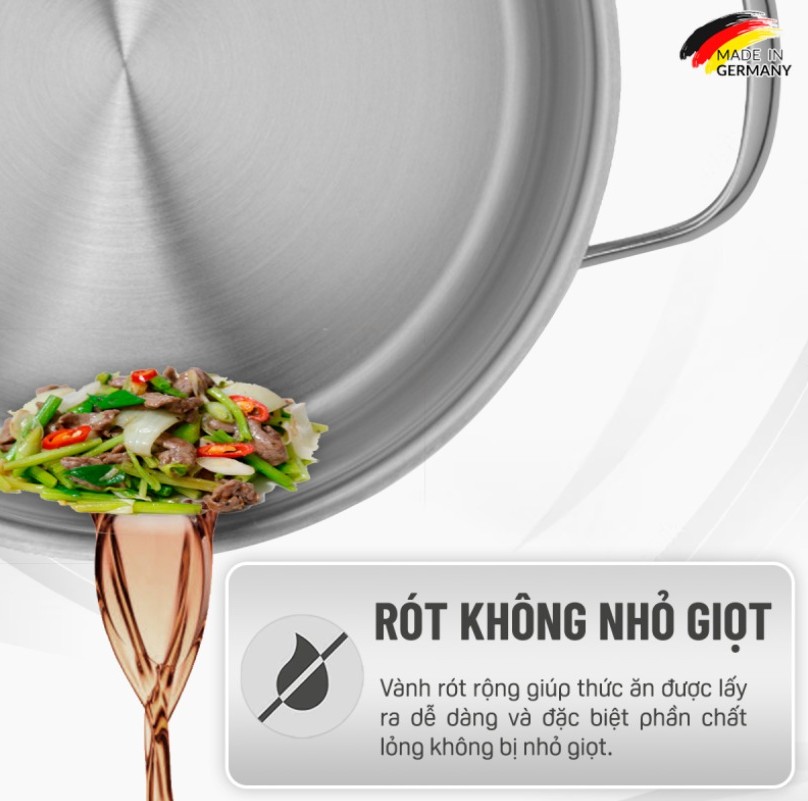 Tính năng nổi bật: Đáy TransTherm (mọi bếp, tối ưu bếp từ), vành rót rộng, tay cầm giảm nhiệt, dễ vệ sinh, an toàn máy rửa bát.