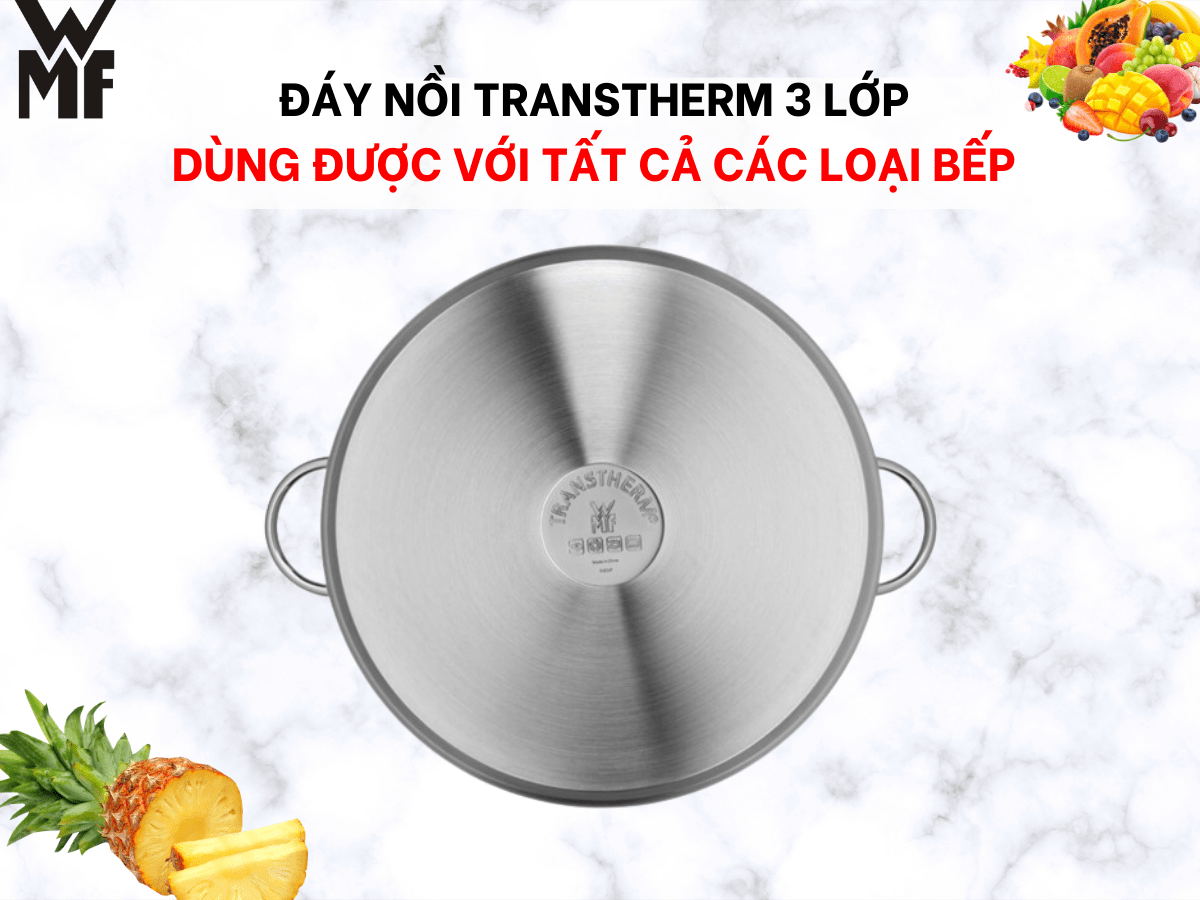 Đáy nồi là bộ phận ảnh hưởng trực tiếp đến khả năng truyền nhiệt và chất lượng món ăn. Bộ Nồi 3 Món WMF DIADEM PLUS 0739176040 được trang bị đáy nồi TransTherm cấu tạo gồm 3 lớp. Lớp nhôm nguyên chất dày được ép chặt ở giữa hai lớp vật liệu Cromargan. Lớp nhôm này có khả năng hấp thụ nhiệt cực nhanh và phân bố nhiệt đều ra khắp bề mặt đáy và cả thành nồi. Nhờ đó, món ăn sẽ được gia nhiệt đều từ dưới lên trên và quanh thành nồi, giúp chín đều ở mọi vị trí, giữ trọn hương vị.