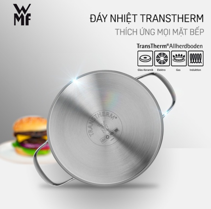 Điểm nổi bật của Bộ Nồi 4 Món WMF PROVENCE PLUS 0723046380 chính là đáy nồi Transtherm 3 lớp. Công nghệ đáy nồi này không chỉ dẫn nhiệt cực nhanh mà còn giữ nhiệt rất tốt, giúp phân phối nhiệt đều khắp bề mặt đáy và thành nồi. Nhờ đó, việc nấu nướng trở nên hiệu quả hơn, thực phẩm chín đều và nhanh hơn, đồng thời tiết kiệm đáng kể năng lượng.