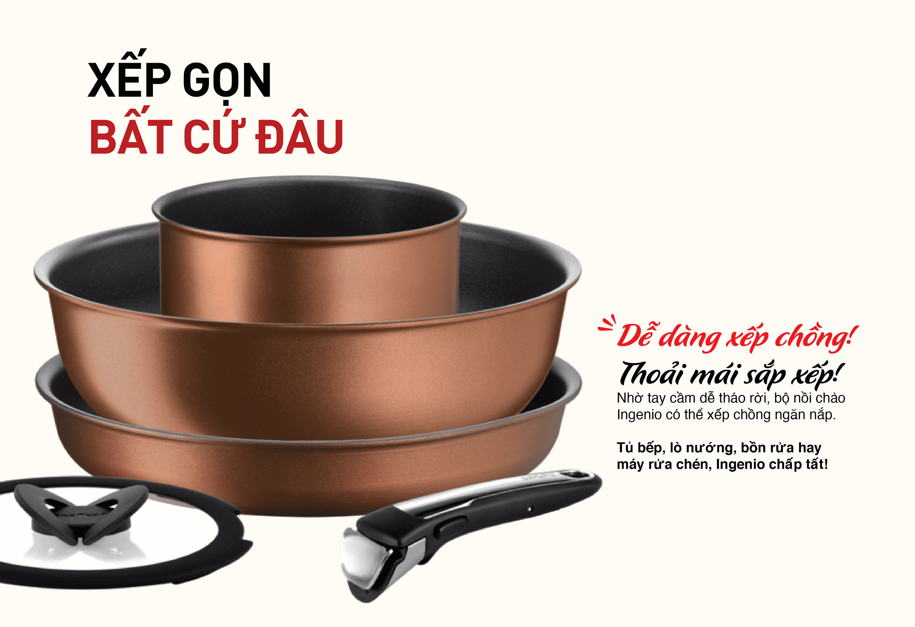 Bộ nồi chảo cán rời 5 món Tefal Ingenio Resource L6759522 có cán rời dễ dàng tháo lắp trên nồi chảo, nồi/chảo có thể dùng cho máy rửa chén và lò nướng, đa dạng món ăn từ bánh đến các món như súp, xào, chiên, nướng.