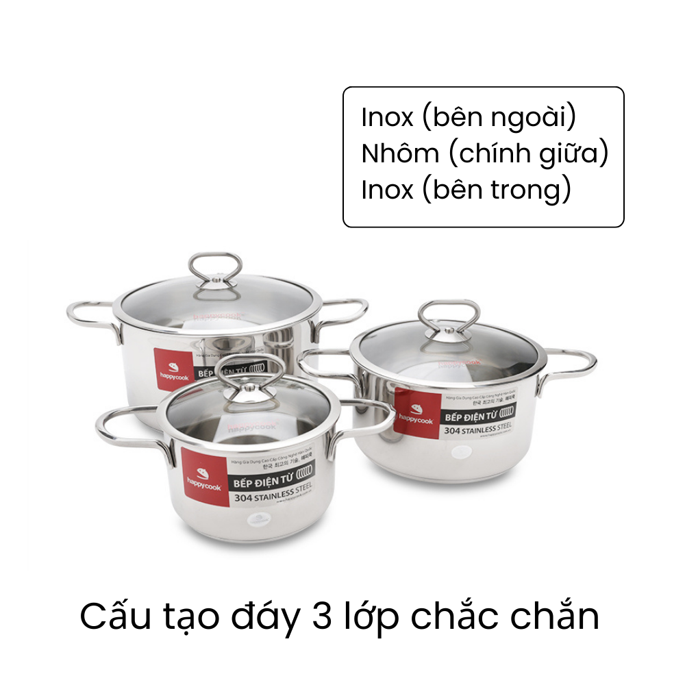 Thiết kế sang trọng, tinh tế: Bộ nồi inox 3 đáy Happycook Delux HC06DLG có thiết kế sang trọng, tinh tế, mang lại nét đẹp hiện đại cho không gian bếp của bạn. Bộ nồi bao gồm 3 nồi kèm theo 3 nắp kính cường lực tương ứng phù hợp với nhu cầu nấu nướng của gia đình gồm các size: 16 - 20 - 24cm, nồi lớn nấu gà dưới 1.5 kg.