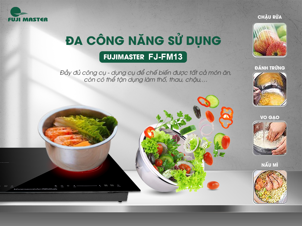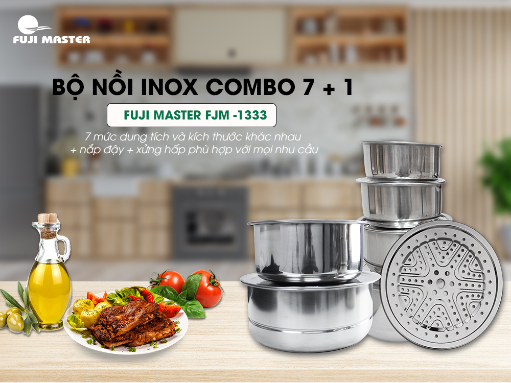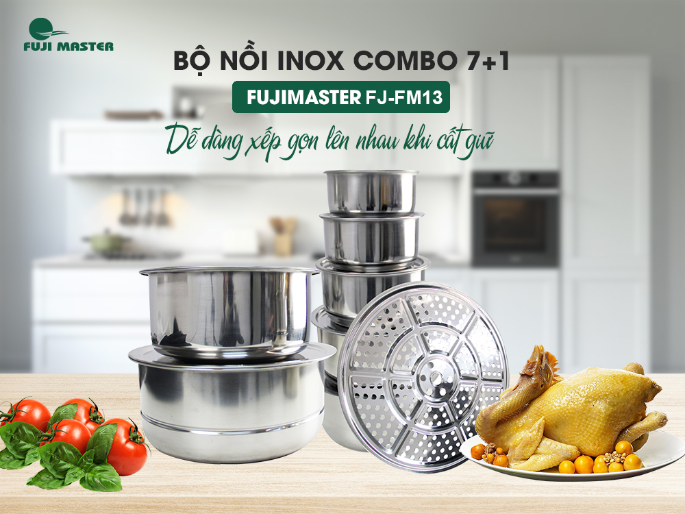 Bộ nồi inox Fuji Master FJ-FM13 mang lại sự linh hoạt và đa năng đáng kinh ngạc. Với 7 kích cỡ khác nhau, bạn có thể dễ dàng chọn nồi phù hợp cho từng món ăn – từ những món cần dung tích nhỏ như trứng hấp đến các món lẩu, hầm nhiều nguyên liệu. Ngoài chức năng nấu nướng thông thường, bộ nồi còn có thể tận dụng như thố đựng, thau trộn gỏi hay chậu rửa rau củ vô cùng tiện lợi.