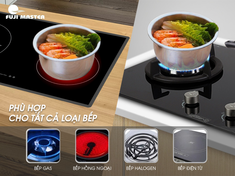 Sản phẩm có thể sử dụng trên mọi loại bếp, kể cả bếp từ – điều mà nhiều loại nồi inox khác không đáp ứng được. Bạn không cần lo lắng về việc tương thích thiết bị khi thay đổi bếp.