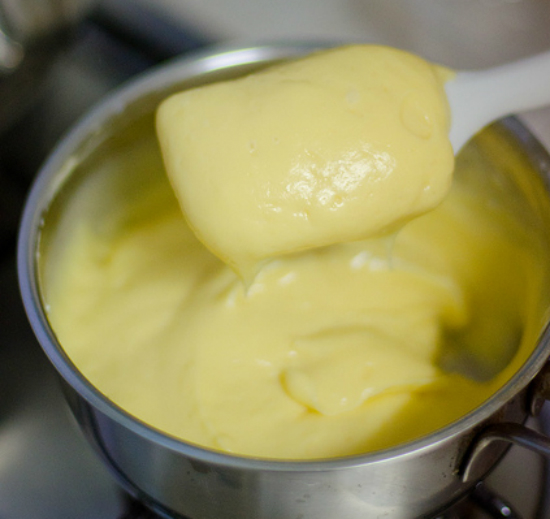 - Bước 3: Đổ sữa từ từ vào hỗn hợp trứng khuấy đều tay cho trứng chin không bị tanh, sau đó đổ ngược lại vào nồi, khuấy cho bột sệt lai tắt bếp cho thêm vani và bơ lạt vào khuấy cho bơ tan đều trong hỗn hợp.