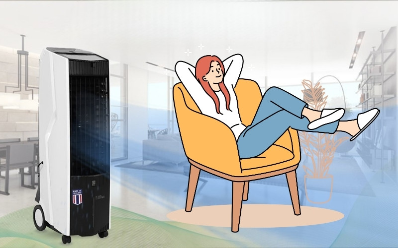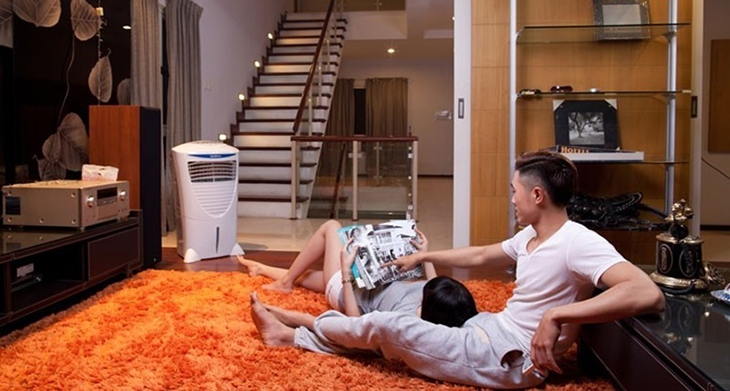 Bạn có thể đặt quạt điều hòa trong phòng khách, ban công hoặc hành lang mở. Vì không phun sương nên quạt an toàn với thiết bị điện tử và nội thất gỗ.