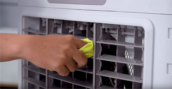 Lau chùi màng chắn bụi, rửa tấm làm mát và súc bình nước mỗi tuần hoặc mỗi tháng. Quạt sạch thì hiệu quả làm mát cao hơn và không tốn điện.