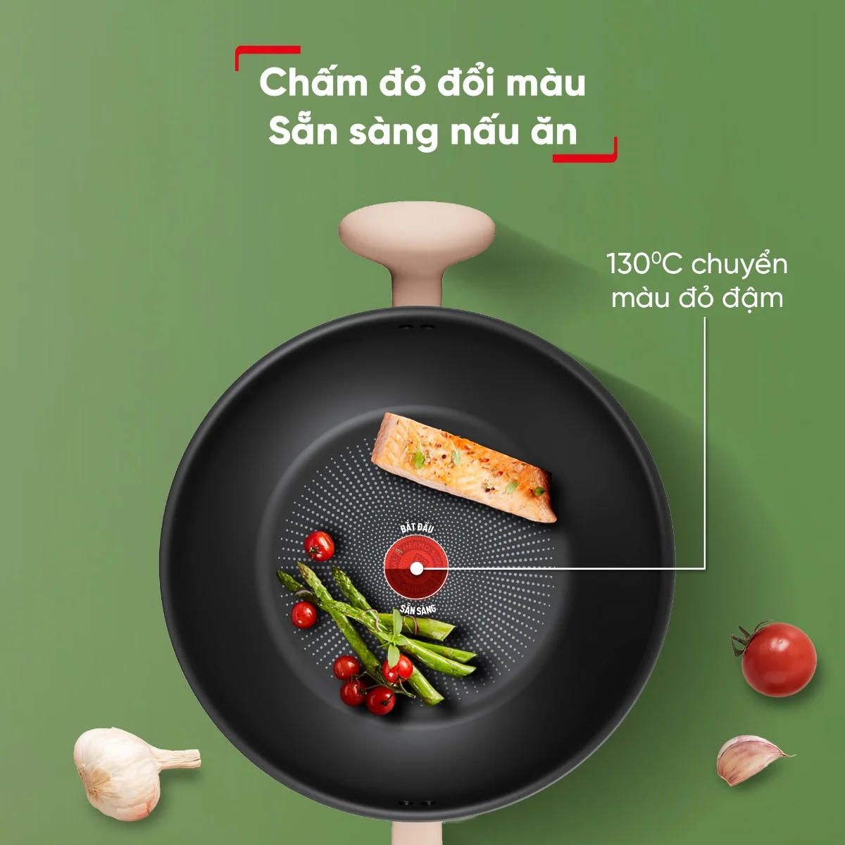 Một trong những điểm cộng lớn của Chảo Chiên Tefal So Matcha chính là công nghệ Thermo-spot độc quyền. Vòng báo nhiệt sẽ chuyển màu khi chảo đạt đến nhiệt độ lý tưởng để bắt đầu nấu, giúp bạn kiểm soát nhiệt chính xác, đảm bảo món ăn chín đều và giữ trọn hương vị.