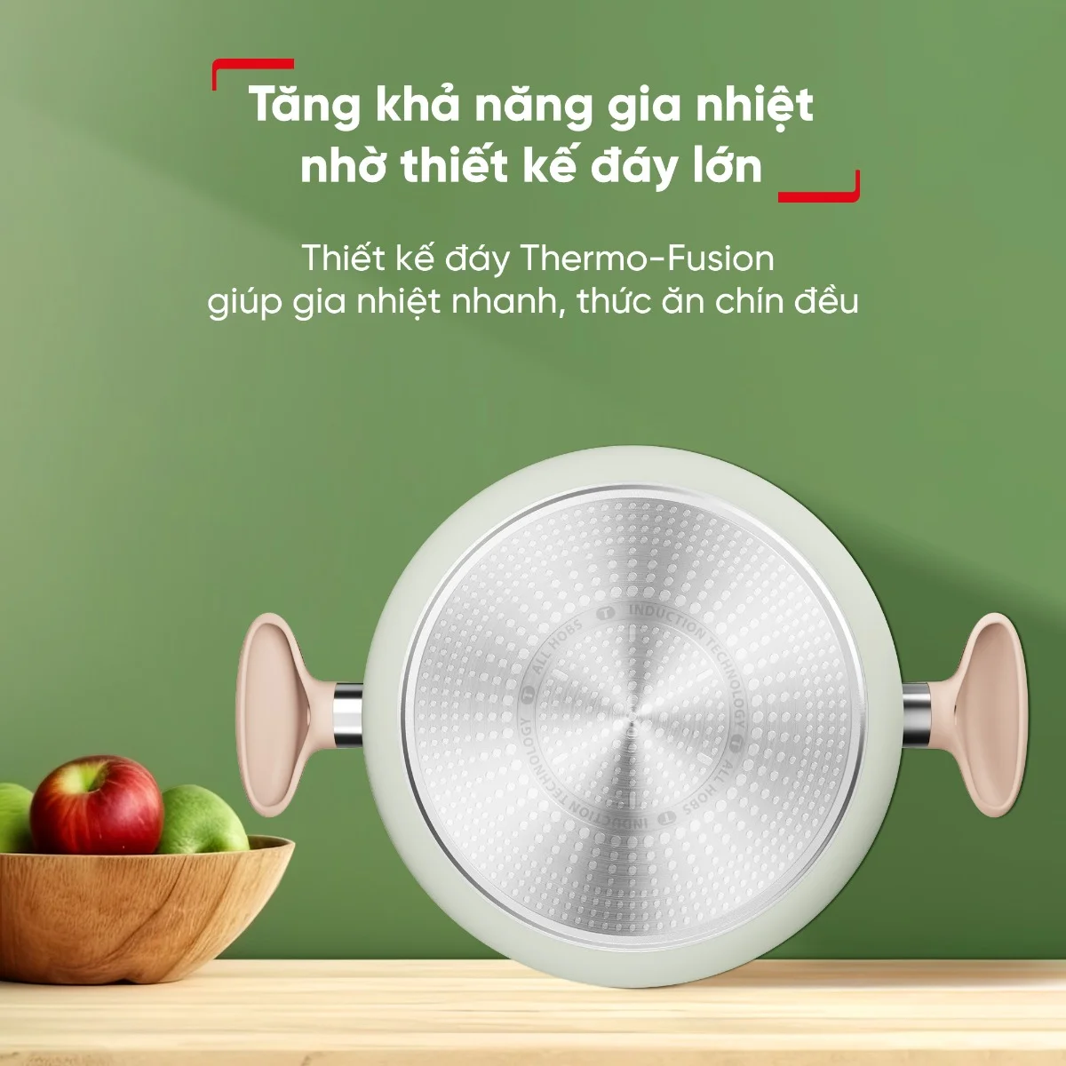 Chảo trang bị đế từ cải tiến Thermo-Fusion, giúp bắt từ cực nhanh và truyền nhiệt đồng đều. Nhờ đó, thực phẩm chín đều, không bị cháy xém hay sống bên trong. Bạn có thể yên tâm nấu nướng mọi món ăn từ chiên, xào đến áp chảo mà không lo "sống ngoài, chín trong".