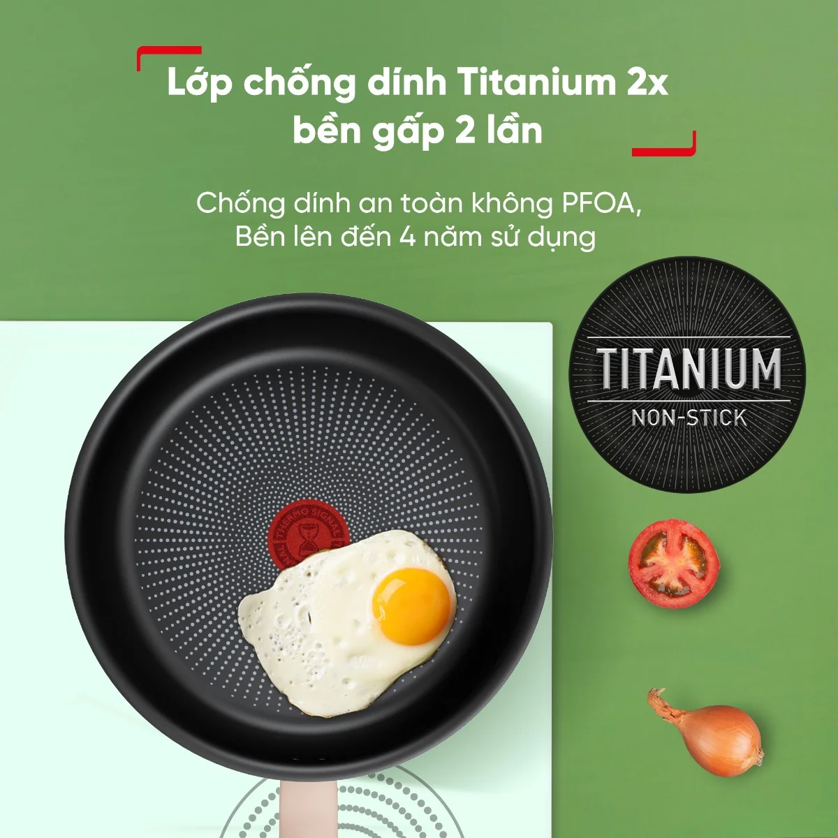 Chảo được phủ lớp chống dính Titanium chất lượng cao, đáp ứng tiêu chuẩn khắt khe của Tefal với độ bền gấp đôi, sử dụng đến 8 năm. Lớp chống dính này hoàn toàn không chứa các chất độc hại như PFOA, chì hay cadmium, đảm bảo an toàn sức khỏe cho cả gia đình.