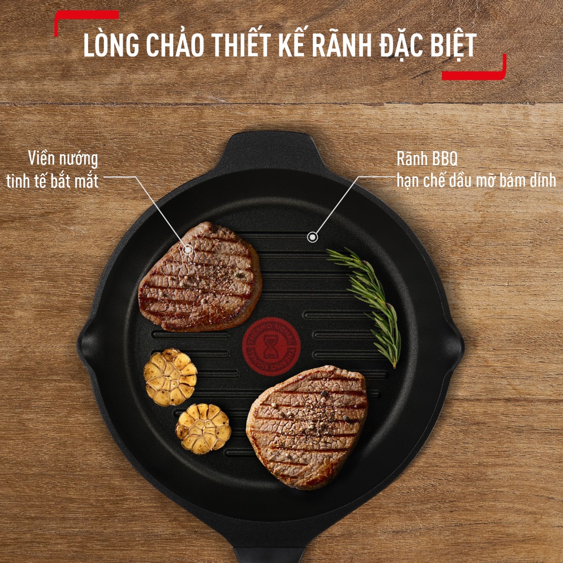 Đặc biệt, lòng chảo được thiết kế rãnh BBQ độc đáo giúp giảm lượng dầu mỡ dư thừa, đồng thời tạo nên những vân nướng đẹp mắt, giúp món ăn vừa hấp dẫn vừa tốt cho sức khỏe.