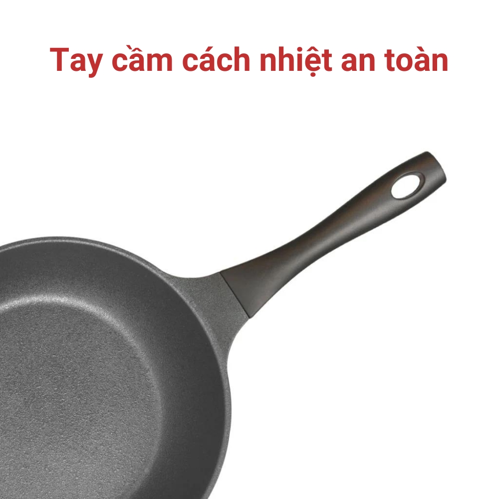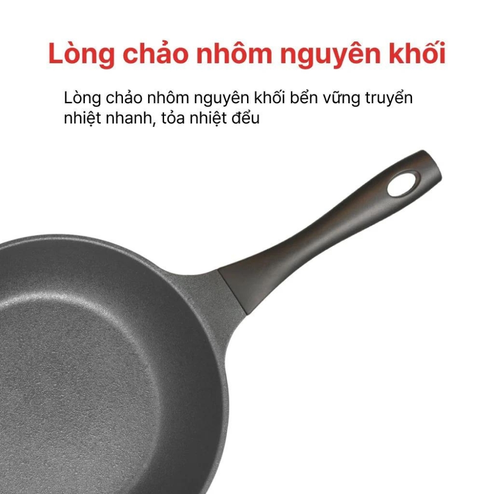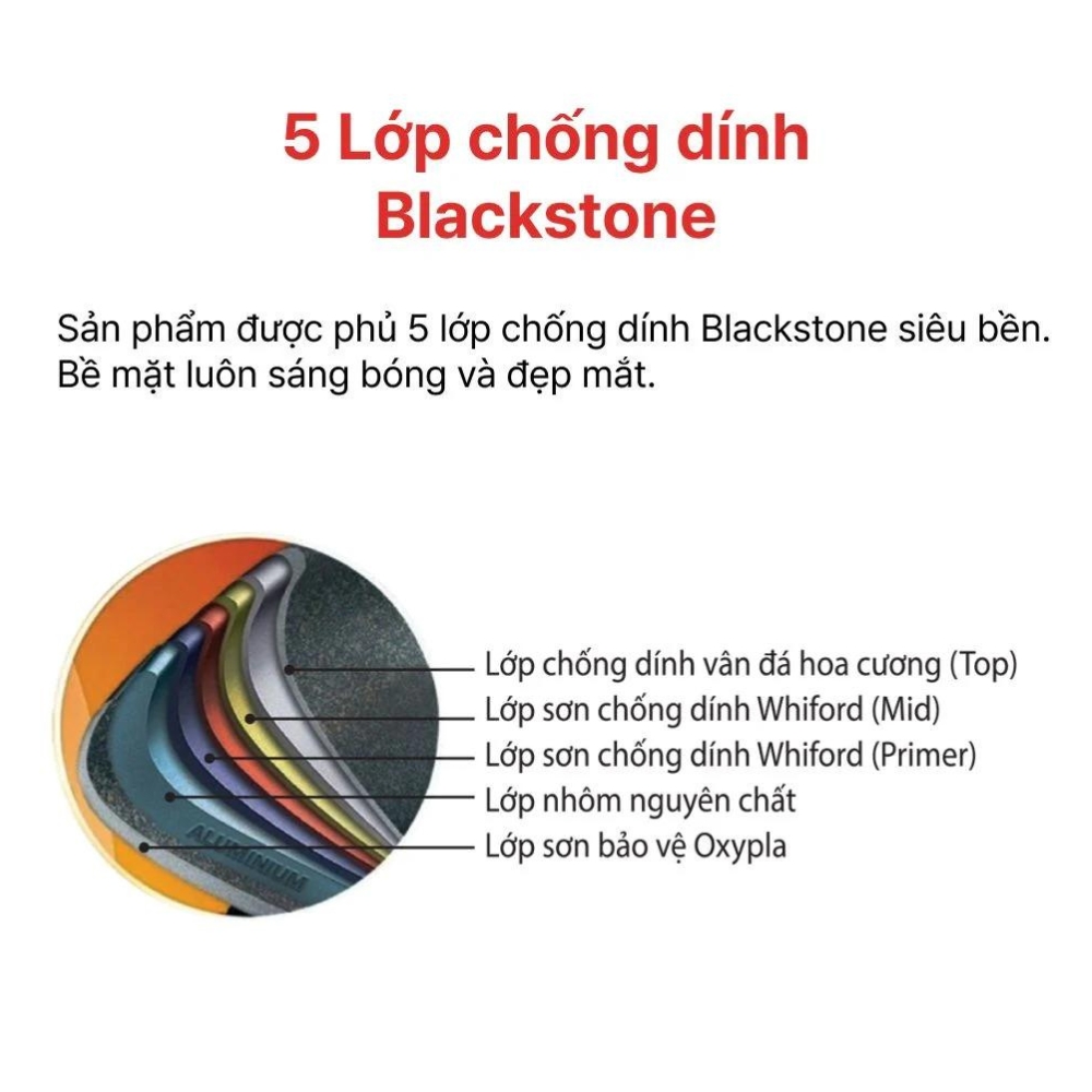 Chảo được đúc bằng nhôm nguyên khối, mang lại sự bền bỉ và chắc chắn. Phủ 5 lớp chống dính Black Stone bao gồm: