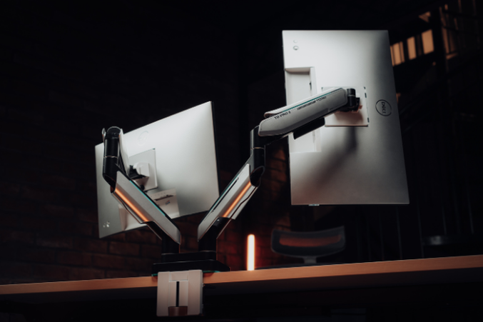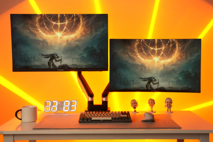 Việc sắp xếp hai màn hình cân đối, thẳng hàng không chỉ giúp dễ quan sát mà còn nâng cao tính thẩm mỹ cho toàn bộ không gian làm việc.