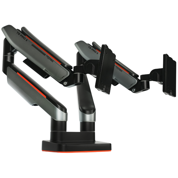 Mỗi tay đỡ trên HumanMotion T9 Pro II Dual cho phép điều chỉnh độ cao riêng biệt, giúp người dùng đặt màn hình ngang tầm mắt, giảm áp lực lên cổ và vai.
