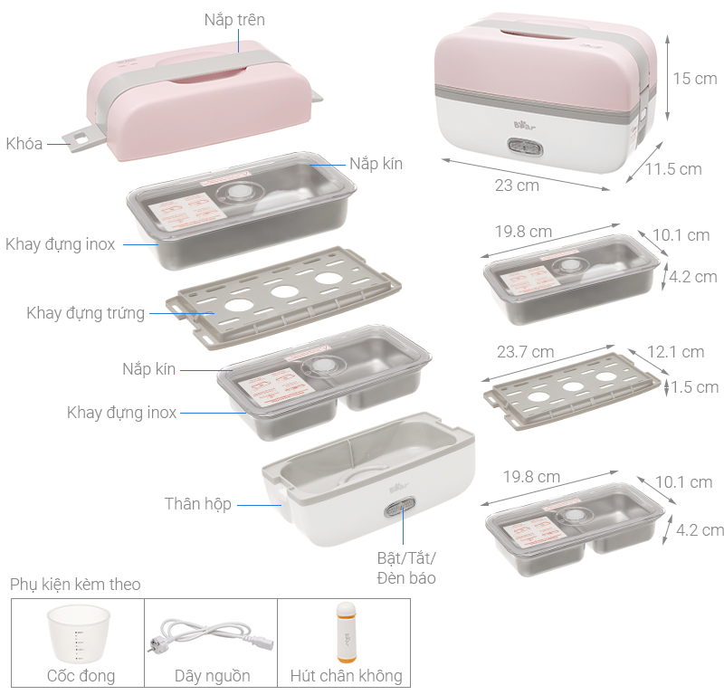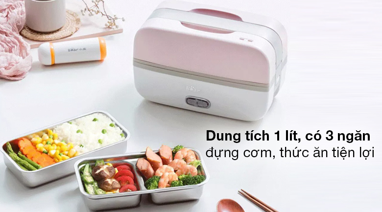 Hộp hâm cơm có dung tích 1 lít, 2 khay đựng, 3 ngăn cho phép đựng cơm, canh và thức ăn mặn tiện lợi