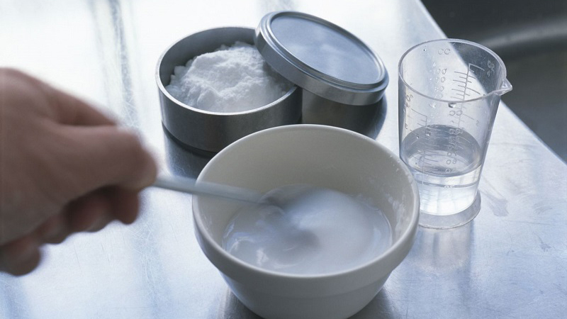 Pha 2 muỗng cà phê baking soda, 1 muỗng cà phê giấm trắng với một ít nước rửa chén.