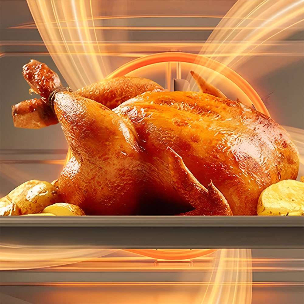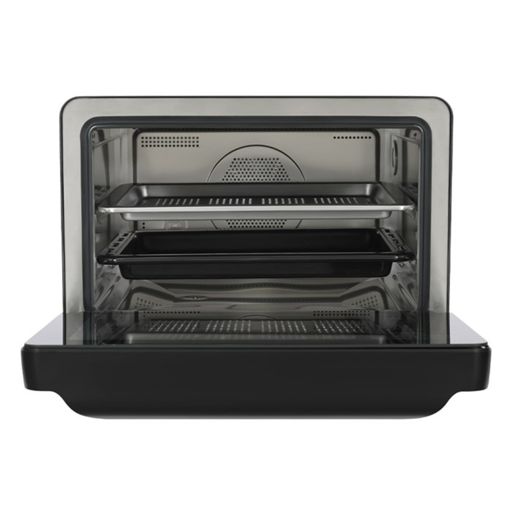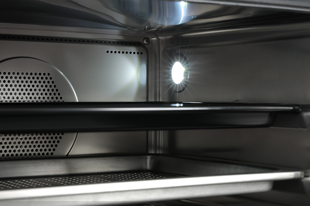 Khoang lò làm bằng thép không gỉ bền bỉ, dễ vệ sinh. Quạt đối lưu kết hợp với đèn chiếu sáng bên trong khoang hỗ trợ tối đa cho việc quan sát và đảm bảo thực phẩm chín đều.