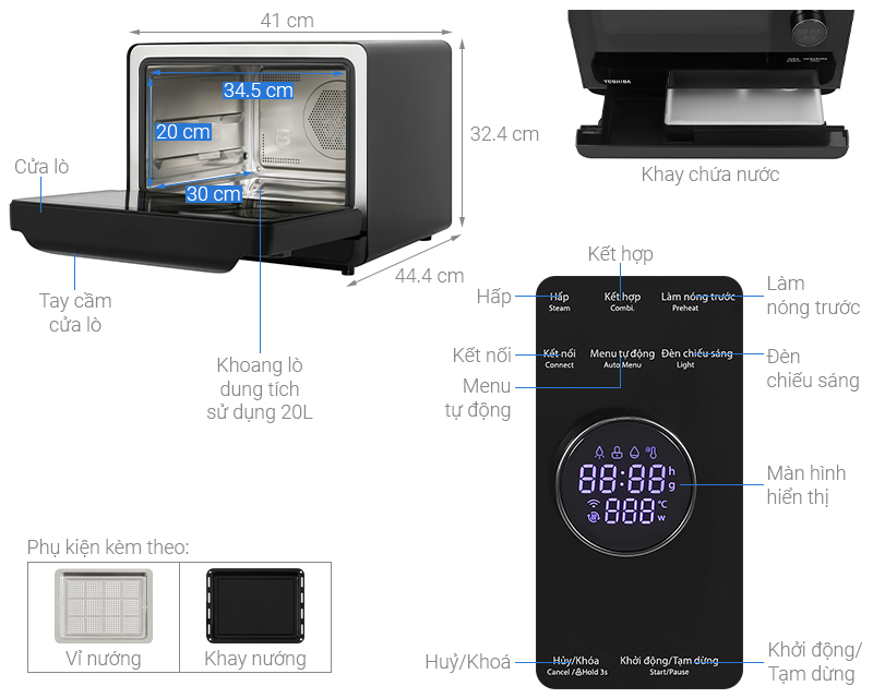 Tự động ngắt khi quá nhiệt, quạt đối lưu, đèn khoang, khóa điều khiển, hẹn giờ, kết nối app, thực đơn tự động, tự làm sạch, cảnh báo nước cạn