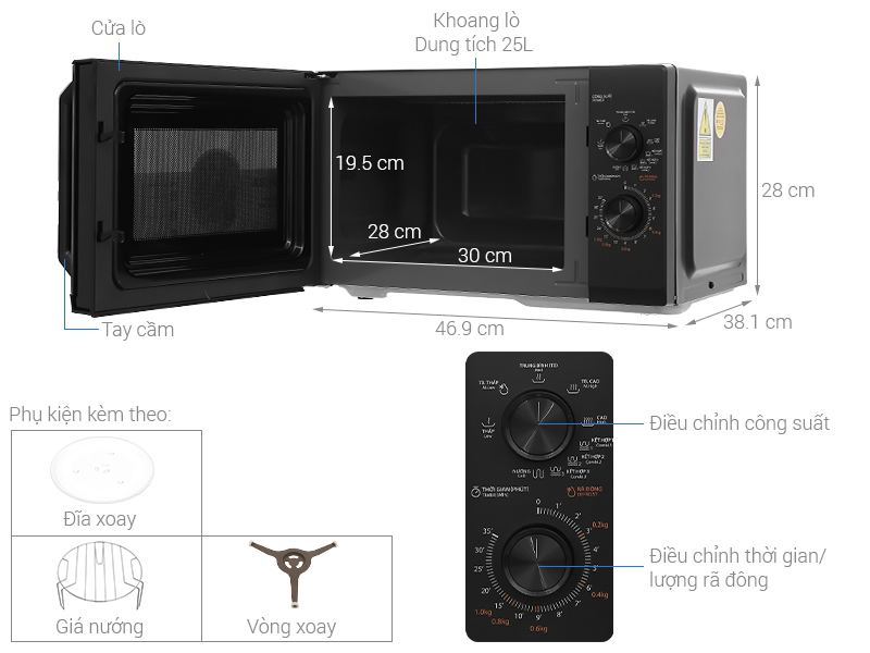 Kích thước khoang lò: Ngang 30 cm - Cao 19.5 cm - Sâu 28 cm