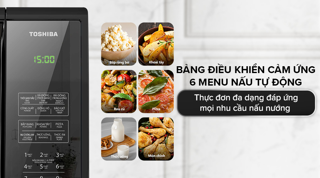 Được trang bị thực đơn nấu tự động tiện lợi, lò vi sóng Toshiba giúp bạn dễ dàng chế biến món ngon mỗi ngày. Mỗi món được cài đặt sẵn mức công suất và thời gian riêng biệt, chỉ cần một lần nhấn nút, mọi thao tác nấu nướng còn lại đều được Toshiba xử lý gọn gàng.