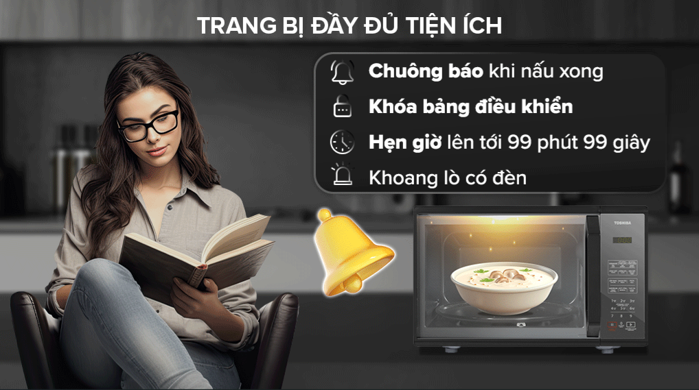 Lò vi sóng Toshiba còn được tích hợp hàng loạt tiện ích hữu dụng như: khóa bảng điều khiển an toàn cho trẻ nhỏ, chuông báo khi nấu xong, đèn khoang lò tiện quan sát, ghi nhớ chương trình nấu, và hẹn giờ linh hoạt lên tới 99 phút 99 giây.