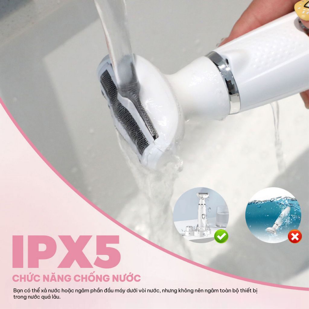 Sản phẩm đạt tiêu chuẩn chống nước IPX5, cho phép vệ sinh đầu máy dưới vòi nước sau khi sử dụng.