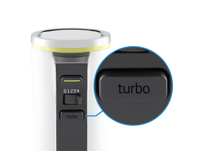 Máy còn được tích hợp nút Turbo, hỗ trợ tăng tốc độ đánh nhanh và mạnh, đặc biệt hữu ích khi xử lý những hỗn hợp đặc hoặc có độ kết dính cao như bột bánh, hỗn hợp kem đặc.