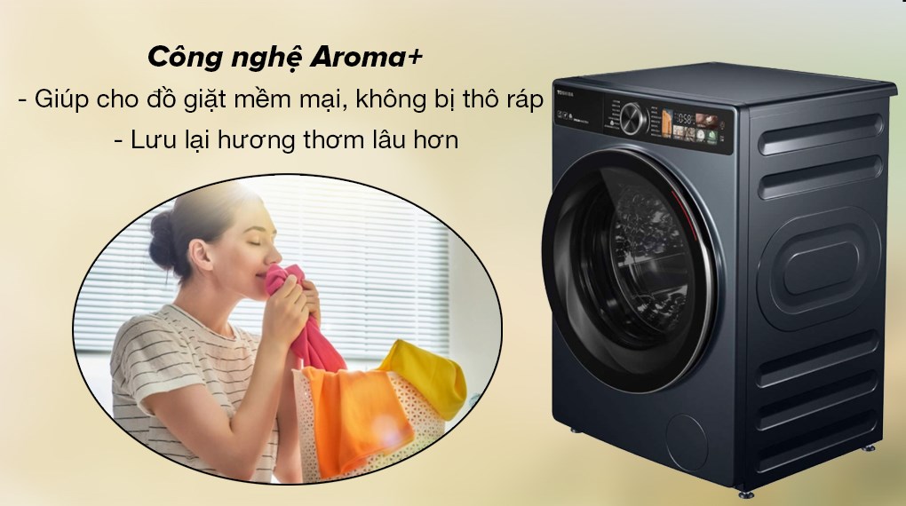 Công nghệ độc quyền Aroma+ của Toshiba tinh chỉnh tối ưu nhiệt độ nước, độ hòa tan của nước xả vải và thời gian tiếp xúc của quần áo với nước xả, giúp quần áo sau khi giặt và phơi khô có hương thơm mạnh mẽ và độ mềm mại cao hơn.