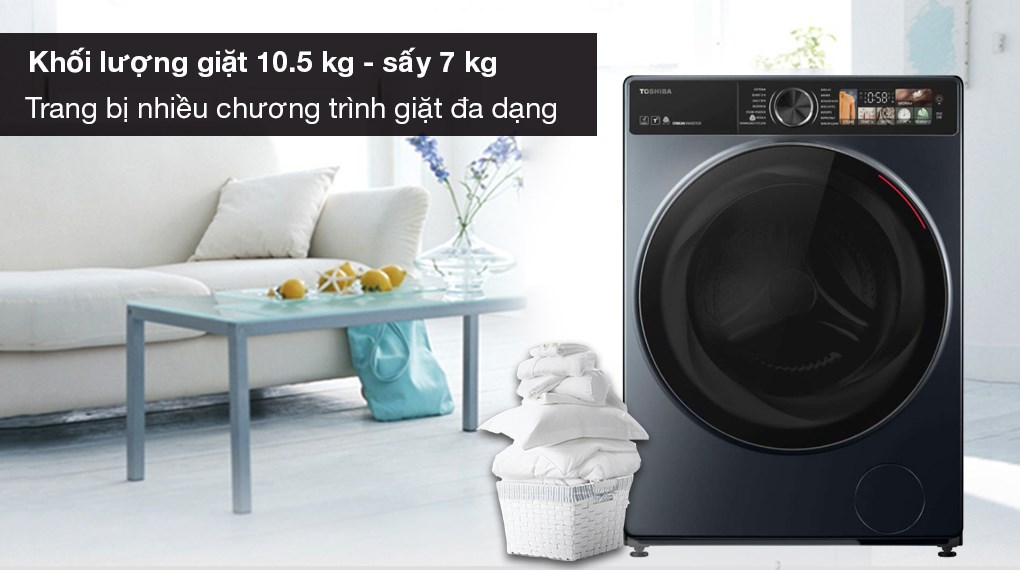 Với khả năng giặt 10.5 kg và sấy 7 kg, sản phẩm này phù hợp cho gia đình trên 7 người. Máy giặt Toshiba Inverter được thiết kế với 14 chương trình giặt sấy đa dạng, đáp ứng mọi nhu cầu sử dụng của gia đình bạn, từ các loại vải khác nhau, thời gian giặt đến các nhu cầu đặc biệt khác.